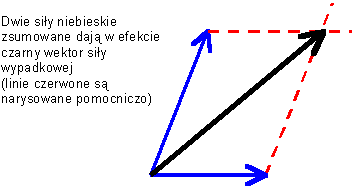 Kilka sił działających na ciałoNa ciało może działać jednocześnie więcej niż jedna siła. W takiej sytuacji wpływy od wszystkich sił - składników dokładają się do siebie i w efekcie otrzymujemy pewien efekt sumaryczny ich działania. Ten efekt połączonych sił ze sobą jest jakby nową siłą zastępczą i nazywany jest siłą wypadkową. Siła ta zastępuje działanie wszystkich sił na raz. Matematycznie obliczenie siły wypadkowej polega na zsumowaniu wektorów sił składowych (patrz: dodawanie wektorów). Przykłady znajdowania siły wypadkowejOto niektóre przypadki dodawania dwóch sił (wyznaczania siły wypadkowej): 1. Siły działające wzdłuż tego samego kierunku i mające ten sam zwrot