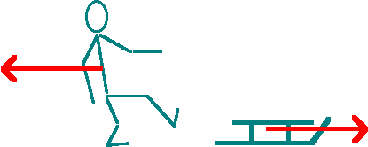 Pęd niesiony przez sanki (w prawo) jest równy co do wartości pędowi odbieranemu przez człowieka (w lewo).