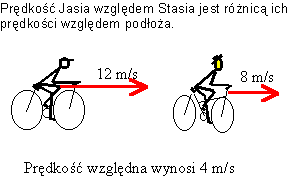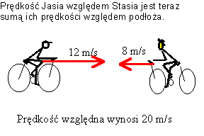 W przypadku gdyby Jaś jechał naprzeciw Stasia, to ich względna prędkość byłaby sumą prędkości względem podłoża i wynosiłaby 20 m/s. Z tą prędkością Jaś zbliża się do Stasia, a Staś do Jasia.