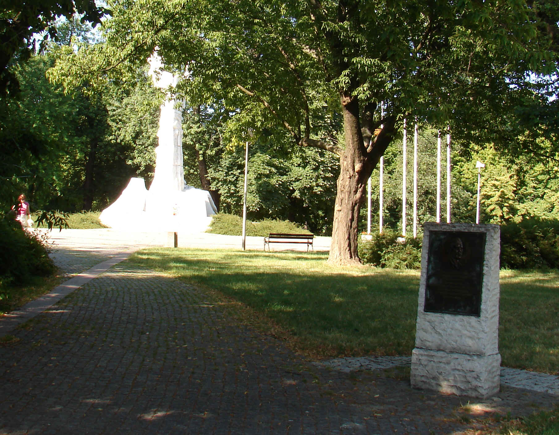 Unikaj silnych kontrastów oświetleniaTa zasada jest pewnym uogólnieniem poprzedniej - w jakimś stopniu jest jej wyjaśnieniem. Powyżej jedno z moich niezbyt udanych zdjęć. Miałem zamiar pokazać na jednym ujęciu tablicę dotyczącą pomnika Monte Cassino, a jednocześnie w dali sam pomnik (stoi on w Warszawie w parku Krasińskich). Ponieważ był słoneczny dzień, to pomnik - który jest z białego kamienia i mocno odbija światło słoneczne - był mocno oświetlony. Tymczasem aparat nastawił swoją czułość na ciemne fragmenty (i słusznie, bo przecież jest ich tutaj więcej). Dlatego sam pomnik jest mocno prześwietlony, "przepalony" - w większości nie widać jego szczegółów, a jedynie jasny, jednolity kształt. Takie efekt wynika z faktu, że element światłoczuły aparatu (matryca CCD, choć ten sam efekt wystąpi w przypadku tradycyjnej kliszy) ma określony zakres jasności, w którym może poprawnie rejestrować szczegóły ujęcia. Aparat nastawia swoja elektronikę (manipulując wartością ISO, szybkością migawki i przysłoną) na określony średni poziom jasności. Jednak wszystkie skrajne fragmenty, przekraczające możliwości matrycy nie zostaną poprawnie zarejestrowane. Dlatego warto zapamiętać zasadę, że elementy silnie kontrastowe - czyli bardzo jasne, z bardzo ciemnymi - rzadko wychodzą dobrze na zdjęciach. Oczywiście dużo zależy tu też od klasy aparatu i wielkości samych kontrastów. Zwykle jednak jest tak że przy sąsiadujących ze sobą bardzo jasnych i bardzo ciemnych elementach sceny, zarówno te najjaśniejsze, jak i najciemniejsze fragmenty zostaną oddane gorzej niż reszta: