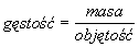 Gęstość można wyrazić wzorem: Przyjęto tu oznaczenia: ρ (grecka litera "ro") - gęstość (w układzie SI w kg/m3) m - masa (w układzie SI w kg) V - objętość (w układzie SI w m3) Co oznacza, że: