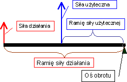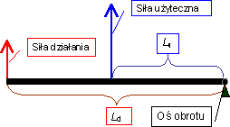 Zysk na sile (przek³adnia d¼wigni) jest równy ilorazowi d³ugo¶ci ramion - si³y dzia³ania i si³y u¿ytecznej. Obowi±zuje identyczny wzór jak dla d¼wigni dwustronnej.